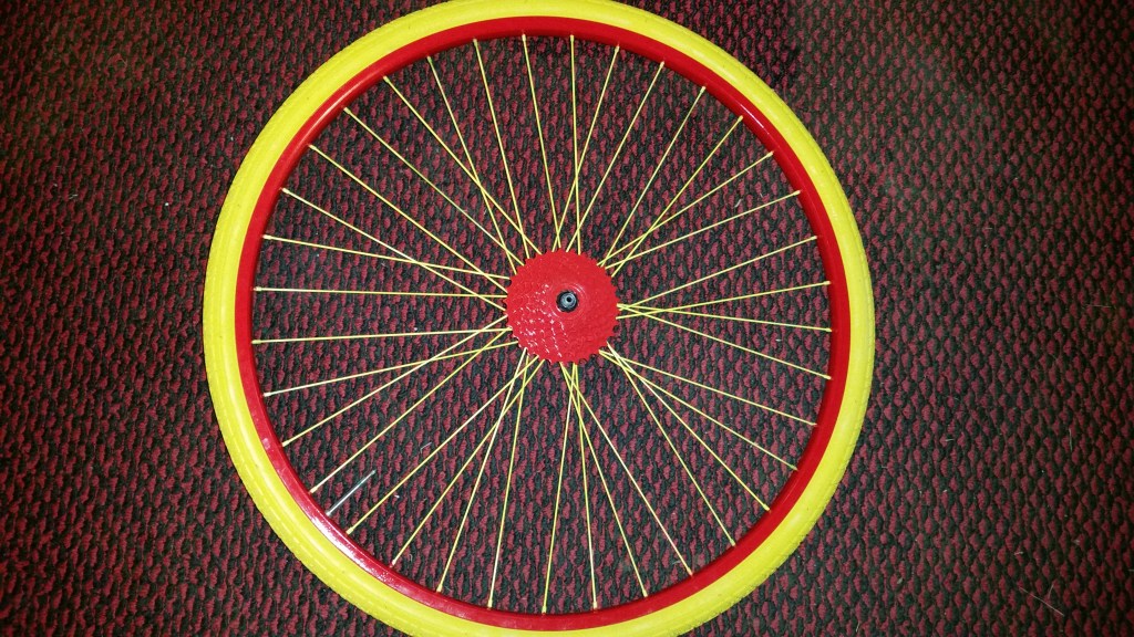 I decided to simply spray it this way and reuse all of the original parts rather than purchasing yellow spokes and spoke nipples and rebuilding the wheel completely. It was simply more economical and quicker. The only new items that I needed to purchase were a 700c yellow tire and a corresponding innertube.