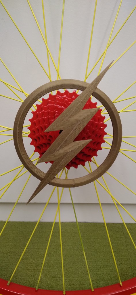 The finished product was really spectacular and eye catching! I didn’t have to sand or paint the logo. I was able to display it in my office with some of my other Flash collectibles that my awesome colleagues and my children gave to me as birthday and Christmas presents over the past few years. Special thanks to my friend Bob for helping me to put together an awesome Flash-themed bicycle wheel!